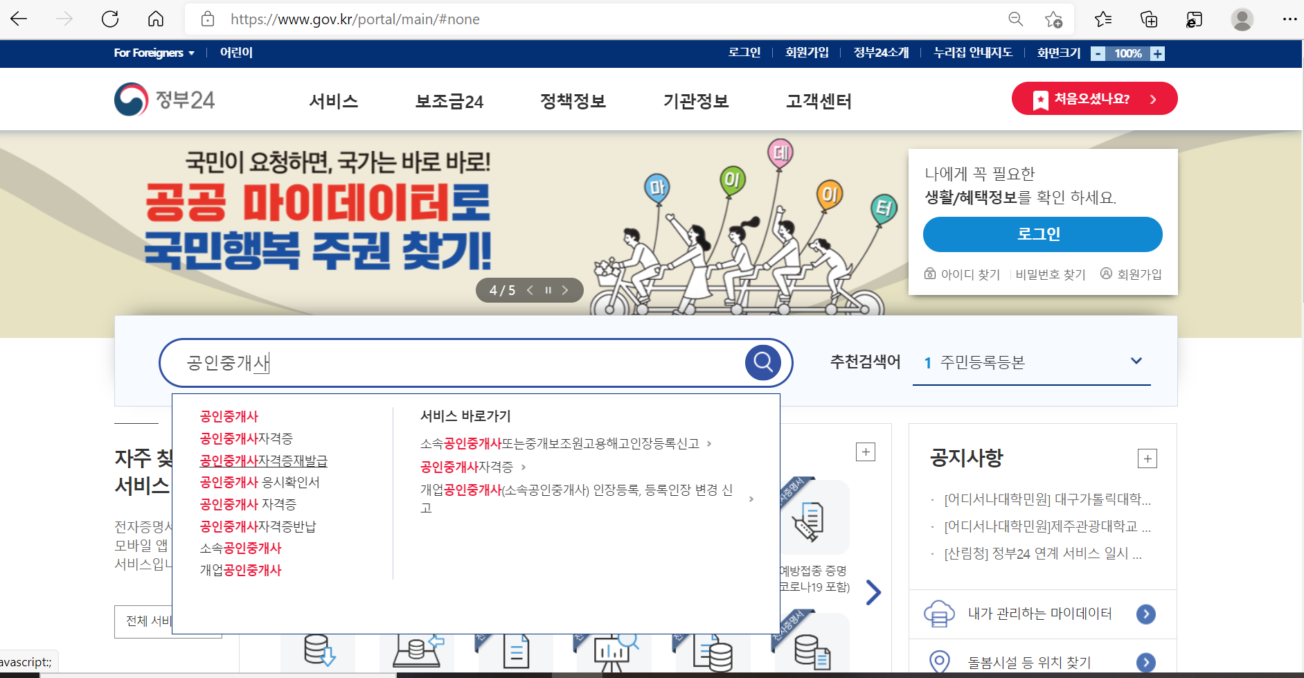 정부24들어가서 공인중개사라고 검색하면 공인중개사자격증이라는 연관검색어가 떠요.