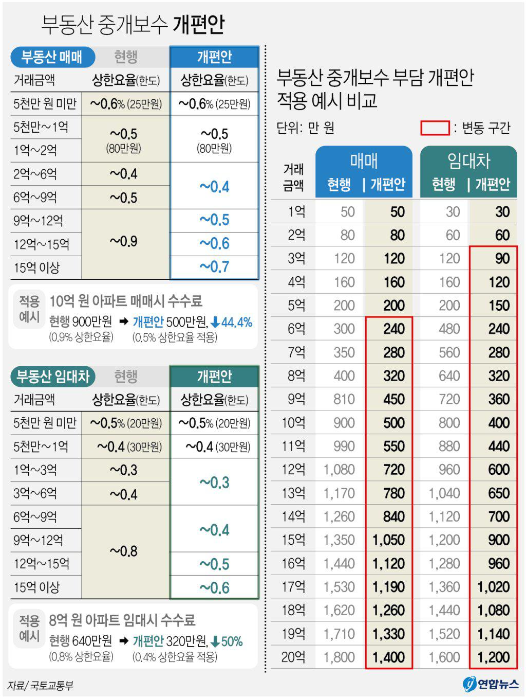 출처 : [팩트체크] 부동산 중개수수료 개편안 시행되면 복비 줄어들까 | 연합뉴스 (yna.co.kr)