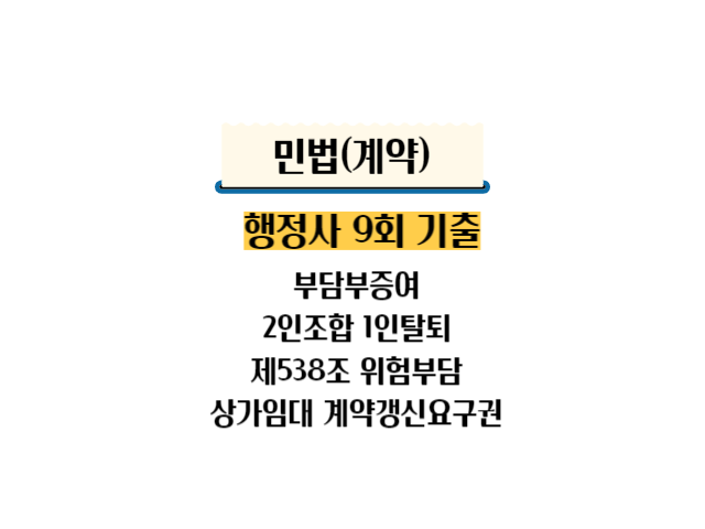 행정사9회 기출문제 부담부증여시 수증자의 망은행위로 인한 해제여부, 합의해제시 제3자 보호, 2인 조합 1인 탈퇴시 법률관계, 제 538조 위험부담, 상가임대 계약갱신요구권 문제에 대하여 박문각 조민기 강사님의 모범답안을 정리하였다.