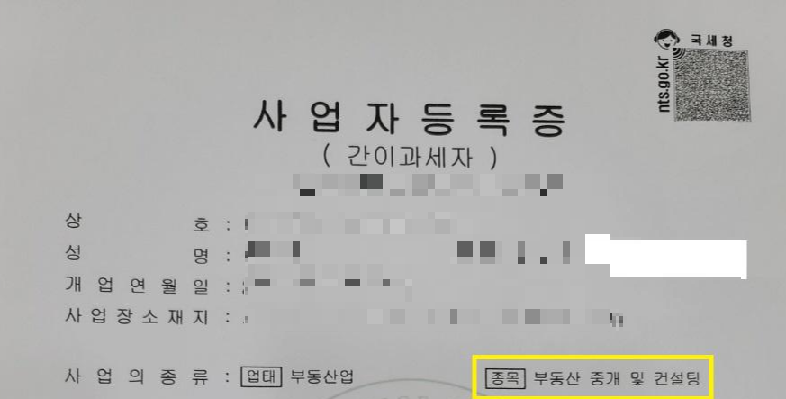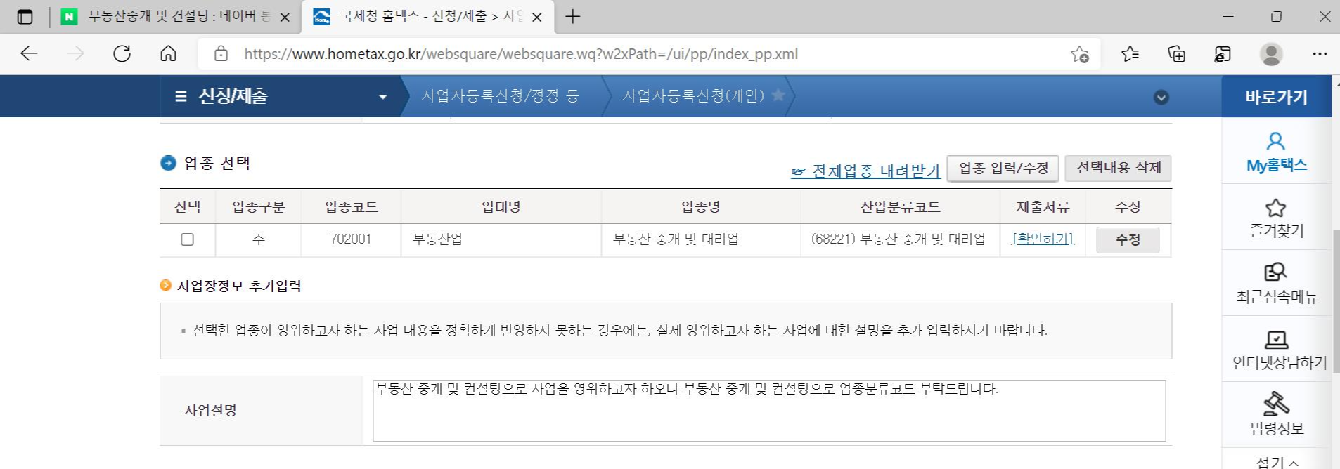 제가 원하는 대로 부동산 중개 및 컨설팅으로 업종이 등록되었습니다.